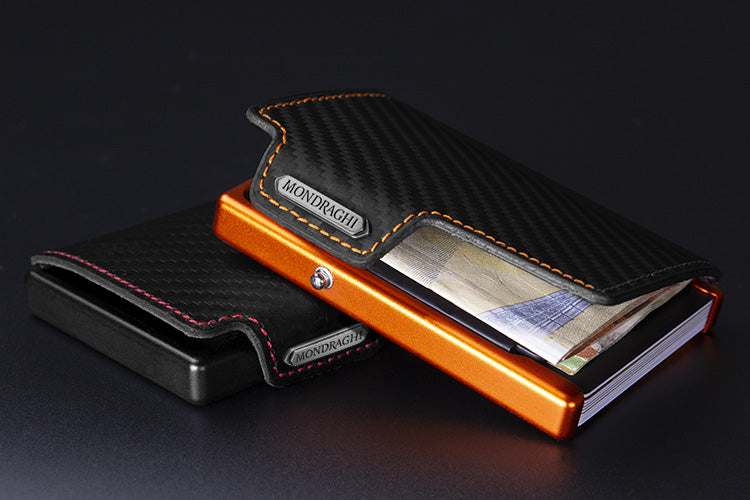 I modelli Mondraghi Racing Carbon si distinguono per la particolare finitura dellapelle con effetto carbonio, che conferisce al mini wallet un look grintoso e contemporaneo. Questa texture esclusiva unisce stile tecnico e raffinatezza, richiamando il mondo delle performance sportive.